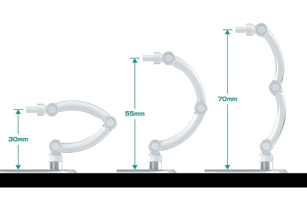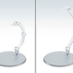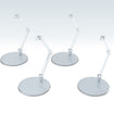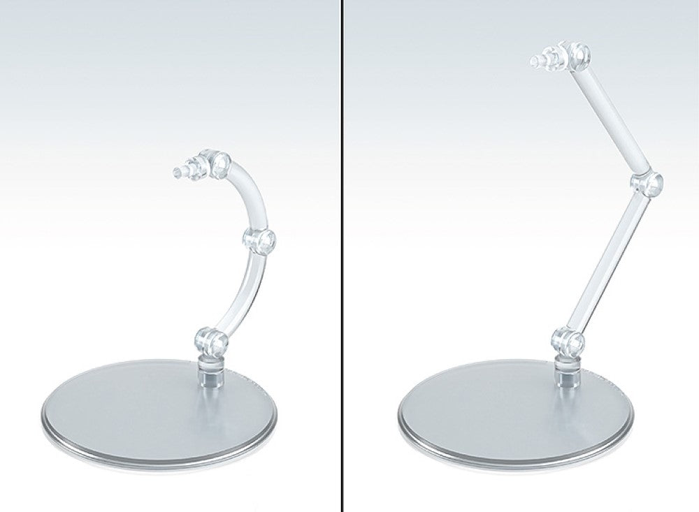 The stands work great with Nendoroid figures! Presenting a set of 4 simple and affordable display stands! These stands, perfect for small figures around 10cm in height, feature a plain, transparent design. The support arm is equipped with a 3mm pin for connecting to holes of corresponding size. Attachable clamp-style parts and hexagonal pin parts for Nendoroid figures* are also included. The stands are made with transparent ABS resin. The diameter of each base is around 6cm. Two types of support arms—a curved type and straight type—are included. The curved support arm can be adjusted from 3 to 7cm in height, while the straight support arm can be adjusted from 4.5 to 10.7cm in height.