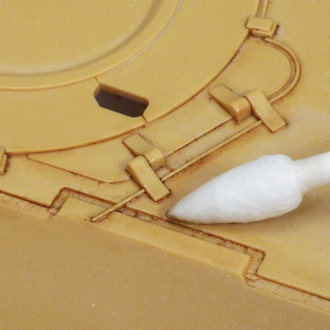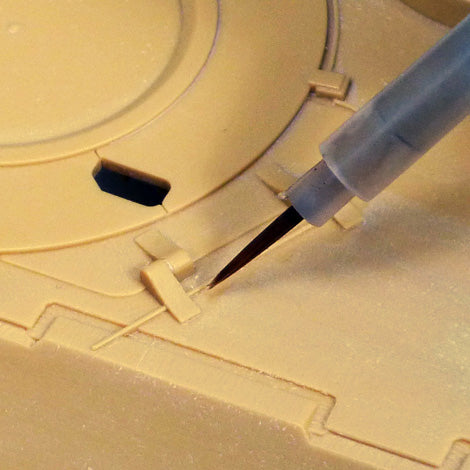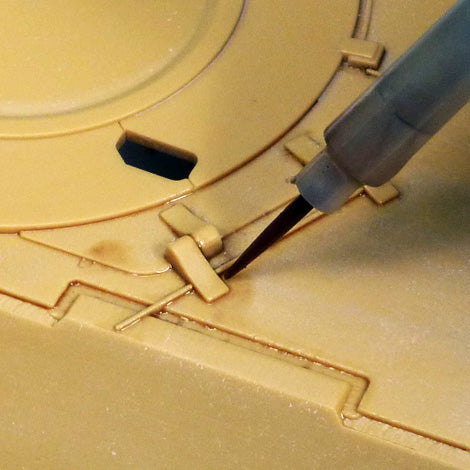 Plastic parts may become brittle when using Tamiya Panel Line accent colors. Avoid using on movable parts and take care when applying to load-bearing areas. Apply over base coat of lacquer or acrylic paint. Accent Color paints may damage underlying base coat. Test before applying it onto the model. Take care when applying on flat base coat colors as Accent Color paints may permeate more readily.