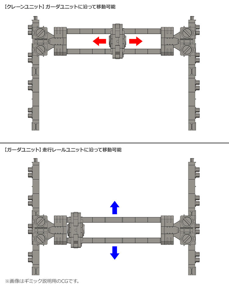 - The Crane Unit can slide horizontally or vertically by attaching to the Girder Unit and Running Rail Unit. Multiple Girder Units and Running Rail Units can be connected together to fit your block base.