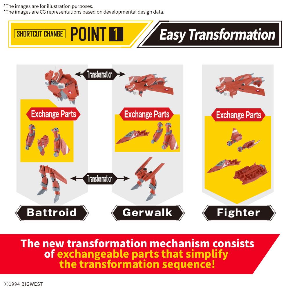 - By incorporating interchangeable parts as part of the transformation mechanism, the transformation sequence has been simplified. It can easily transform into Battroid, Gerwalk, and Fighter.