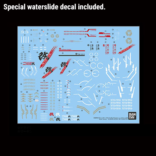The Gundam Astray Red Frame appears again in the Perfect Grade series, sporting its Tactical Arms II L accessory! An upgraded version, the Tactical Arms backpack can convert into multiple forms including neutral V-Form, Sword Form, Arrow Form, Delta Form, and Work Form! In keeping with the "Red Frame" designation, the movable frame around which the Perfect Grade series is designed is molded in red, with a completely articulated structure for exciting and flexible posing. Shoulder units can extend outward for expanded range of movement. Elbows feature multi-joint construction, allowing complex poses such as drawing the sword. Stomach unit features full articulation, including "hydraulic" cylinders. Knee armor designed to move along with poses. Calf frame extends and retracts. Battery-powered light-emitting diode (LED) system can be switched on to illuminate the eyes. The Red Frame Kai's other signature weapons, the "Gerbera Straight" and "Tiger Pierce" swords, feature separate blade, guard, and pommel construction just like real swords. Blade portion is chromed plastic for a realistic finish, and features engraving on the lower part of the blade. Guard and pommel-end are gold chromed plastic with detailed sculpting. Blade is designed so as to be fastened in the pommel with rivets. Additional accessories include detachable beam torch and Action Base for displaying the Tactical Arms IIL in its various forms. Includes instruction manual and water slides. CR1220 battery for LED sold separately.